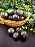 Our Large Labradorite Tumbles showcase a deep, dark hue enhanced by striking high flash, creating a captivating play of light. These elegant stones bring a refined touch of natural beauty to any collection or display.