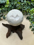 Each of these polished spheres features delicate white plumes suspended in translucent chalcedony, creating the look of drifting snow frozen in stone. Sourced from Indonesia, this variety of agate forms when silica-rich solutions fill volcanic rock cavities and crystallize slowly over time. The “plumes” are typically made of manganese or iron oxide, giving each piece its unique, cloud-like pattern.