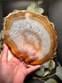 Formed inside ancient lava pockets, agate builds in layers over time as microscopic quartz crystals settle from groundwater. This slice reveals striking concentric banding and a soft, translucent core framed by warm earth tones.